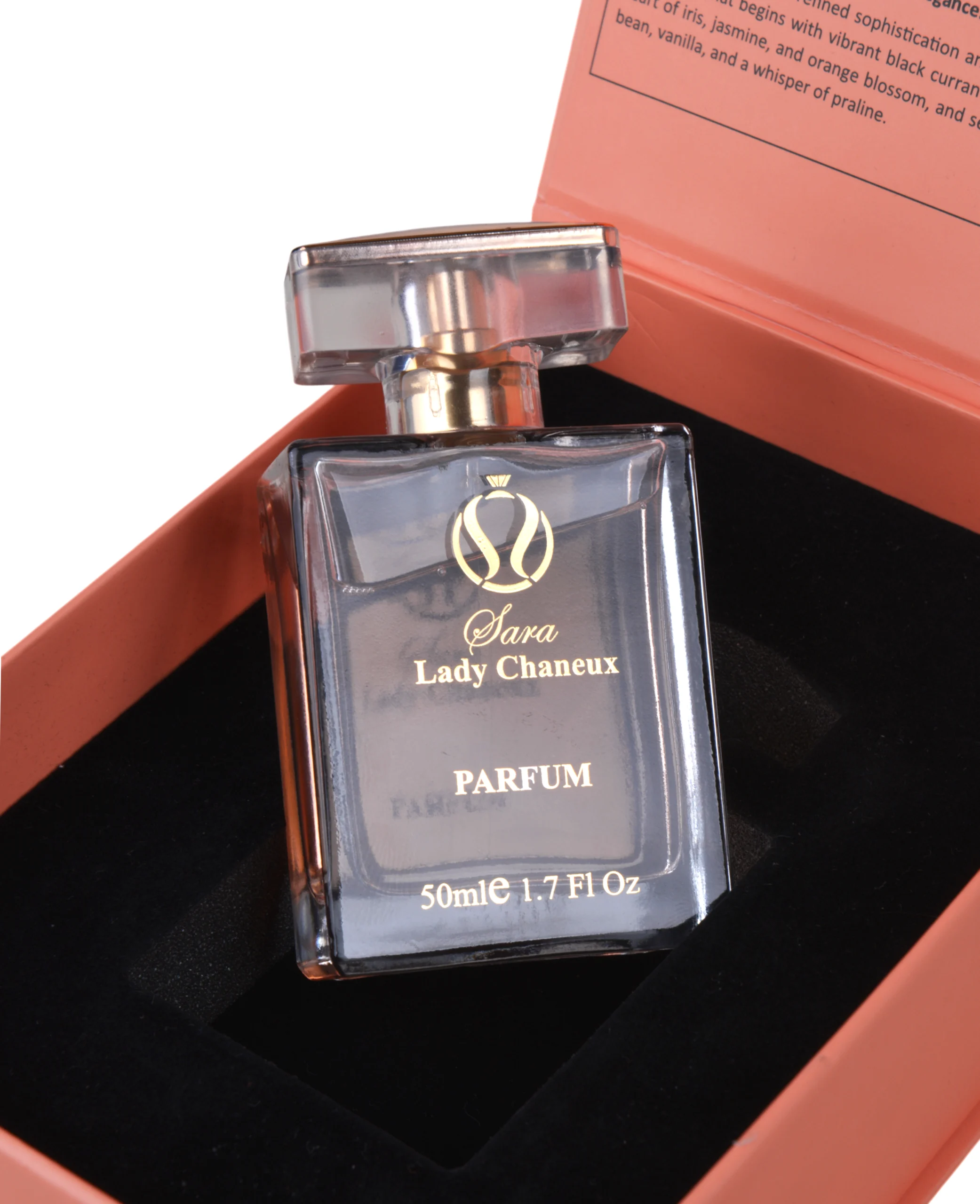 Lady Chaneux exudes refined sophistication and modern grace. A delicate yet captivating symphony that begins with vibrant black currant and fresh pear, transitions to an opulent heart of iris, jasmine, and orange blossom, and settles on a warm base of patchouli, tonka bean, vanilla, and a whisper of praline.